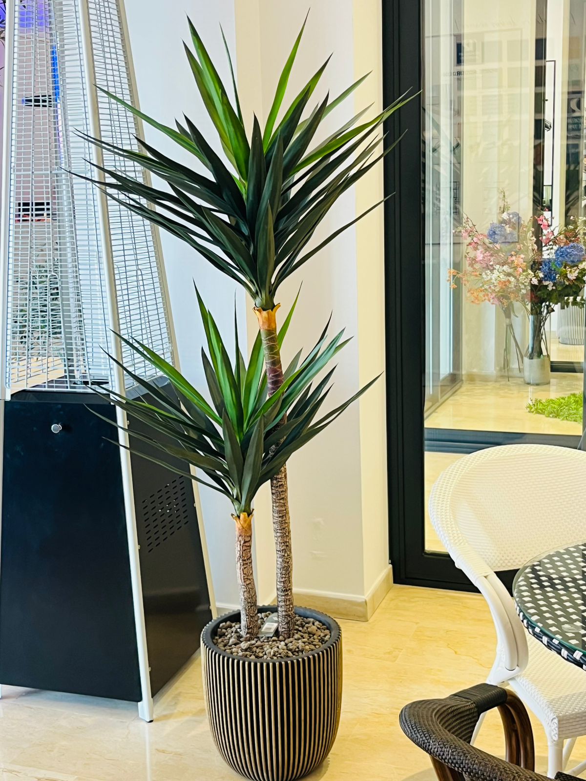 Apportez une touche exotique et contemporaine à votre intérieur avec le Yucca double troncs, une plante majestueuse de 180 cm de hauteur.